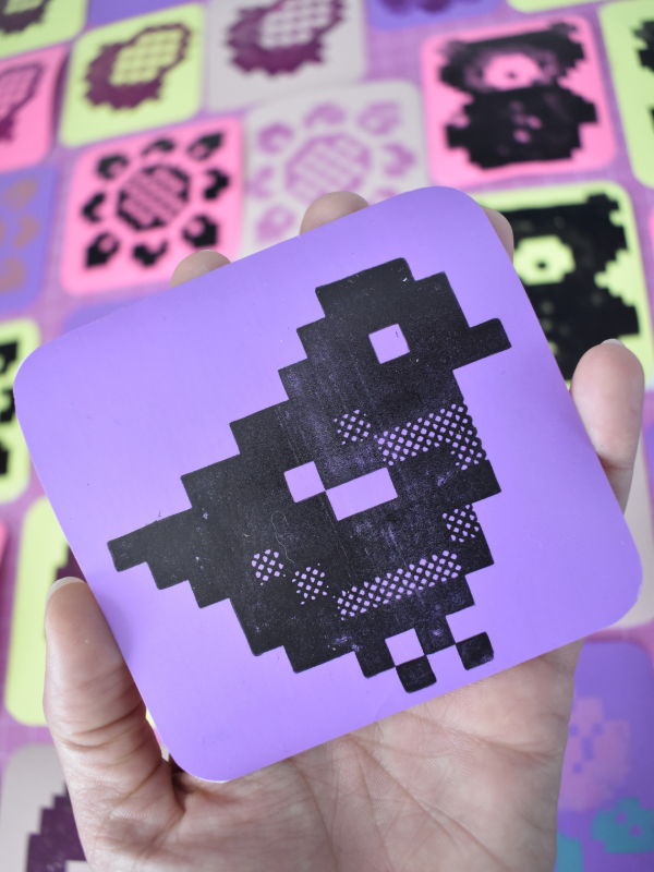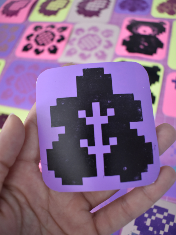 Estos stickers son mini estampas artesanales, impresas a mano con sellos sobre papeles adhesivos de distintos colores y gramajes.